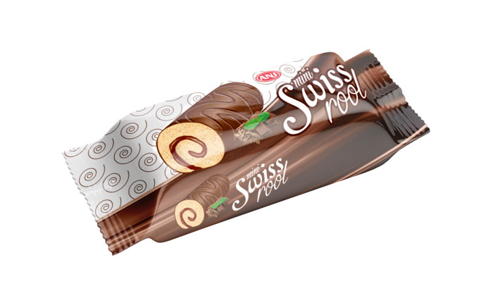 Rolled cake covered with compound milk chocolate and available in different flavors of strawberry, cranberry, hazelnut, caramel, banana.